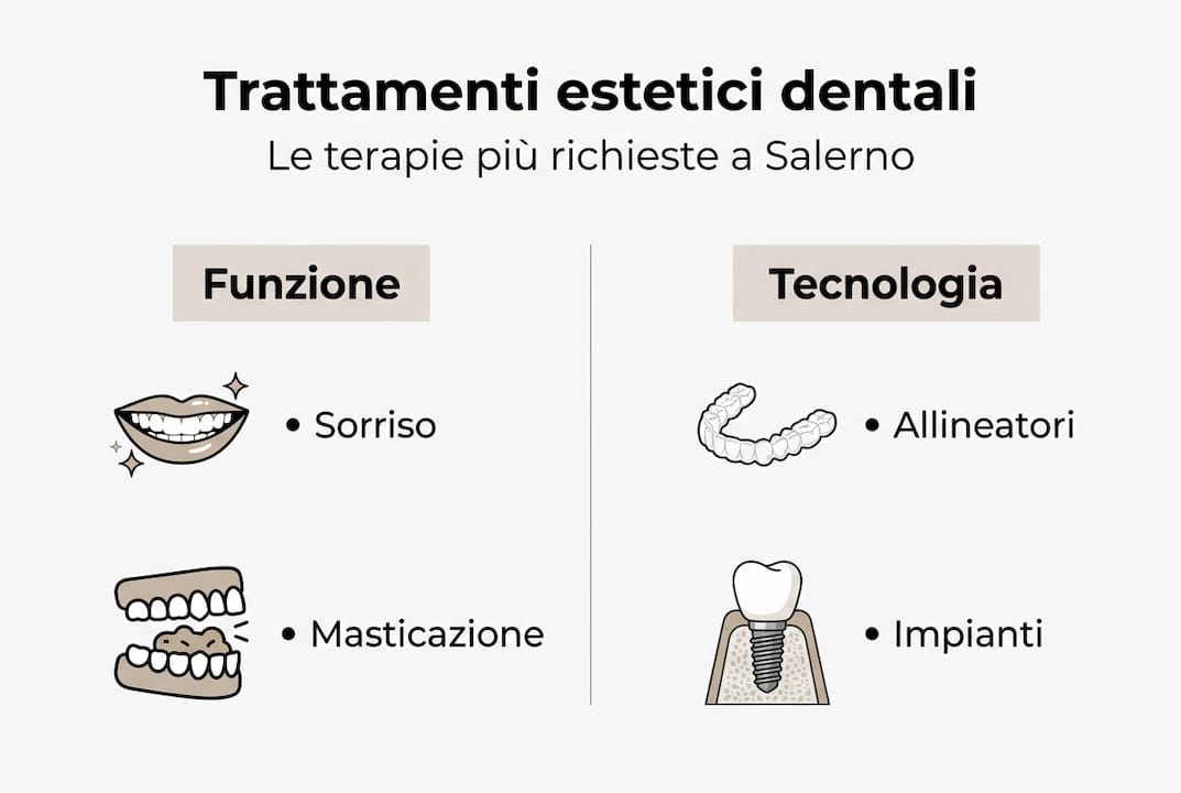 Implantologia, ortodonzia invisibile e faccette sono le terapie più scelte. Le principali cliniche di Salerno propongono queste soluzioni con tecnologie digitali avanzate e risultati verificati.