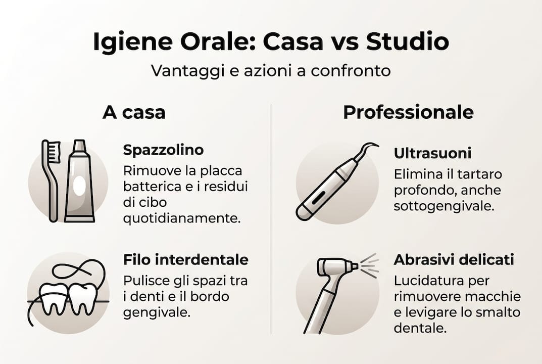 Dopo aver chiarito l'importanza di non sottovalutare la cura, esploriamo le reali differenze tra ciò che si può fare a casa e ciò che solo il dentista può garantire.